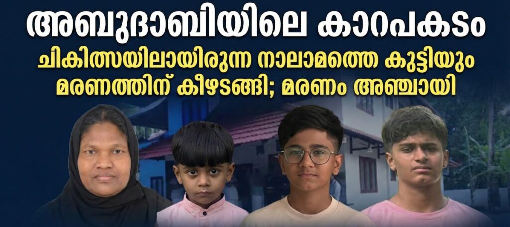 അബുദാബി: അബുദാബിയിൽ മലയാളികൾ സഞ്ചരിച്ചിരുന്ന കാർ അപകടത്തിൽപ്പെട്ട് ചികിത്സയിലായിരുന്ന നാലാമത്തെ കുട്ടിയും മരണത്തിന് കീഴടങ്ങി. മലപ്പുറം കീഴ്ശേരി സ്വദേശിയും ദുബായിലെ വ്യാപാരിയുമായ അബ്ദുൽ ലത്തീഫിന്റെ മകൻ അസാം ബിൻ അബ്ദുല്ലത്തീഫ് (7) ആണ് മരിച്ചത്. ഇതോടെ ഈ ദാരുണമായ അപകടത്തിൽ മരിച്ചവരുടെ എണ്ണം അഞ്ചായി ഉയർന്നു. അബുദാബിയിൽ നിന്ന് മടങ്ങുന്നതിനിടെ ഇവർ സഞ്ചരിച്ചിരുന്ന നിസാൻ പട്രോൾ കാർ അപകടത്തിൽപ്പെടുകയായിരുന്നു. നേരത്തെ, അബ്ദുൽ ലത്തീഫിന്റെ മക്കളായ അഷസ് (14), അമ്മാർ (12), അയാഷ് (5) എന്നിവരും കുടുംബത്തോടൊപ്പം ഉണ്ടായിരുന്ന വീട്ടുജോലിക്കാരി മലപ്പുറം ചമ്രവട്ടം സ്വദേശി ബുഷറയും അപകടത്തെത്തുടർന്ന് മരിച്ചിരുന്നു. പരിക്കേറ്റ് ചികിത്സയിലായിരുന്ന അസാം ഇന്ന് മരണത്തിന് കീഴടങ്ങിയതോടെ ഒരു കുടുംബത്തിലെ നാല് കുഞ്ഞുങ്ങളെയാണ് അബ്ദുൽ ലത്തീഫിന് നഷ്ടമായത്. അപകടത്തിൽ പരിക്കേറ്റ അബ്ദുൽ ലത്തീഫും ഭാര്യയും അദ്ദേഹത്തിന്റെ മാതാവും നിലവിൽ ആശുപത്രിയിൽ ചികിത്സയിൽ തുടരുകയാണ്. മലപ്പുറം കീഴ്ശേരി സ്വദേശികളായ ഈ കുടുംബത്തിന് സംഭവിച്ച വലിയ ദുരന്തം പ്രവാസി മലയാളി സമൂഹത്തിനിടയിൽ കടുത്ത നോവായി മാറിയിരിക്കുകയാണ്.