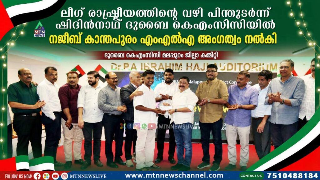 കോഴിക്കോട് ബേപ്പൂർ നിയോജക മണ്ഡലത്തിലെ രാമനാട്ടുകര നഗരസഭാ മുൻ കൗൺസിലറും ദളിത് ലീഗ് നേതാവുമായ ഗോപി പരുത്തിപ്പാറയുടെ മകൻ ഷിദിൻനാഥ് ദുബൈ കെഎംസിസിയിൽ അംഗത്വമെടുത്തു. പിതാവിന്റെ രാഷ്ട്രീയ പാത പിന്തുടർന്ന് മുസ്ലിം ലീഗ് പ്രസ്ഥാനത്തിന്റെ ഭാഗമായി പ്രവർത്തിക്കാനുള്ള താല്പര്യവുമായാണ് ഷിദിൻനാഥ് ദുബൈ കെഎംസിസി ആസ്ഥാനത്തെത്തിയത്. ദുബൈയിലെ ഒരു പ്രമുഖ കമ്പനിയിൽ ഉദ്യോഗസ്ഥനായ ഷിദിൻനാഥിനെ കെഎംസിസി പ്രവർത്തകർ ആവേശപൂർവ്വമാണ് സ്വീകരിച്ചത്. മലപ്പുറം ജില്ലാ പഞ്ചായത്ത് യുഡിഎഫ് ഭരണസമിതിയുടെ പ്രത്യേക പരിപാടി ദുബൈ കെഎംസിസി ഓഡിറ്റോറിയത്തിൽ നടക്കുന്നതിനിടെയാണ് ഷിദിൻനാഥിന് മെംബർഷിപ്പ് നൽകാൻ തീരുമാനിച്ചത്. പ്രതിപക്ഷമില്ലാത്ത ജില്ലാ പഞ്ചായത്ത് യുഡിഎഫിന് സമ്മാനിച്ച മലപ്പുറം ജില്ലയുടെ പരിപാടിയിൽ വെച്ച് തന്നെ പുതിയ അംഗത്തെ ചേർക്കുന്നത് ഉചിതമാകുമെന്ന് ഭാരവാഹികൾ തീരുമാനിക്കുകയായിരുന്നു. ജനറൽ സീറ്റിൽ അഡ്വ. എ.പി. സ്മിജിയെ ജില്ലാ പഞ്ചായത്ത് വൈസ് പ്രസിഡന്റായി പാണക്കാട് സയ്യിദ് സാദിഖലി ശിഹാബ് തങ്ങൾ നിയോഗിച്ച മലപ്പുറം ജില്ലയുടെ ആവേശകരമായ പശ്ചാത്തലത്തിലായിരുന്നു ഈ ചടങ്ങ്. നജീബ് കാന്തപുരം എംഎൽഎ ഷിദിൻനാഥിന് ദുബൈ കെഎംസിസി മെംബർഷിപ്പ് കൈമാറി. സാമൂഹ്യ, സേവന, ജീവകാരുണ്യ പ്രവർത്തനങ്ങളിൽ ഇനിമുതൽ ദുബൈ കെഎംസിസി പ്രവർത്തകർക്കൊപ്പം ഷിദിൻനാഥും സജീവമായി പ്രവർത്തിക്കും.