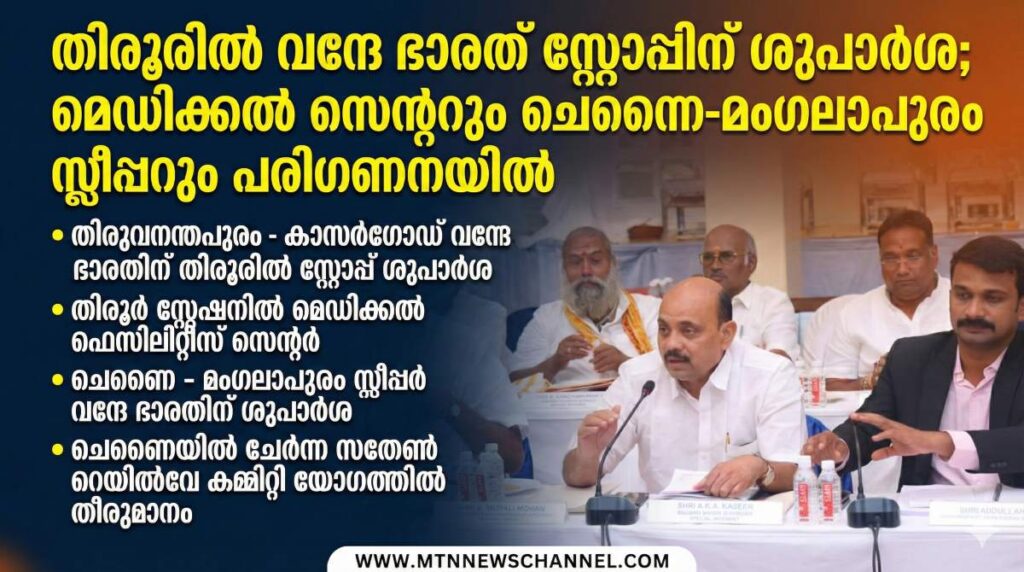 സതേൺ റെയിൽവേയുടെ വികസന പദ്ധതികളുമായി ബന്ധപ്പെട്ട് തിരൂർ റെയിൽവേ സ്റ്റേഷന് നിർണ്ണായക നേട്ടങ്ങൾ. ചെന്നൈയിൽ ചേർന്ന സതേൺ റെയിൽവേ യൂസേഴ്സ് കൺസൽറ്ററ്റീവ് കമ്മിറ്റി യോഗത്തിലാണ് യാത്രക്കാർക്ക് ഏറെ പ്രതീക്ഷ നൽകുന്ന തീരുമാനങ്ങൾ ഉണ്ടായത്. തിരൂർ റെയിൽവേ സ്റ്റേഷനിൽ സതേൺ റെയിൽവേയുടെ മെഡിക്കൽ ഫെസിലിറ്റീസ് സെന്റർ തുടങ്ങണമെന്ന കമ്മിറ്റി അംഗം എ.കെ.എ നസീറിന്റെ ആവശ്യത്തിന് ജനറൽ മാനേജർ ആർ.എൻ സിംഗ് അനുകൂല മറുപടി നൽകി. യാത്രക്കാരുടെ ദീർഘകാല ആവശ്യമായ തിരുവനന്തപുരം – കാസർഗോഡ് വന്ദേ ഭാരത് എക്സ്പ്രസിന് (20634, 20633) തിരൂരിൽ സ്റ്റോപ്പ് അനുവദിക്കുന്ന കാര്യത്തിൽ റെയിൽവേ ബോർഡിനോട് ശുപാർശ ചെയ്യാൻ യോഗത്തിൽ തീരുമാനമായി. ഇതിനു പുറമെ, ചെന്നൈയിൽ നിന്ന് മംഗലാപുരത്തേക്ക് പുതിയ വന്ദേ ഭാരത് സ്ലീപ്പർ ട്രെയിൻ ആരംഭിക്കണമെന്ന ആവശ്യത്തിലും റെയിൽവേ ബോർഡിന് ശുപാർശ നൽകുമെന്ന് ജി.എം ഉറപ്പുനൽകിയിട്ടുണ്ട്. മലപ്പുറം ജില്ലയിലെ റെയിൽവേ യാത്രാസൗകര്യങ്ങൾ വർദ്ധിപ്പിക്കുന്നതിൽ ഈ തീരുമാനങ്ങൾ വലിയ മാറ്റമുണ്ടാക്കും.