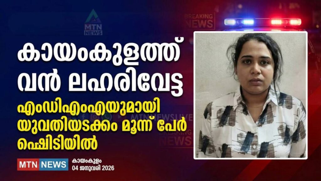 കായംകുളത്തിന്റെ വിവിധ ഭാഗങ്ങളിൽ ജില്ലാ ലഹരി വിരുദ്ധ സ്ക്വാഡും പൊലീസും ചേർന്ന് നടത്തിയ മിന്നൽ പരിശോധനയിൽ മാരക രാസലഹരിയായ എംഡിഎംഎയുമായി യുവതിയടക്കം മൂന്ന് പേർ പിടിയിലായി. കരീലക്കുളങ്ങര, തൃക്കുന്നപ്പുഴ പൊലീസ് സ്റ്റേഷൻ പരിധികളിലായാണ് പരിശോധന നടന്നത്. കരീലക്കുളങ്ങര പൊലീസ് സ്റ്റേഷൻ പരിധിയിൽ ഏവൂർ വടക്കുംമുറിയിൽ വാടകയ്ക്ക് താമസിക്കുന്ന നൗഫിയ (30) ആണ് ആദ്യം പിടിയിലായത്. ഇവരുടെ പക്കൽ നിന്ന് 7.25 ഗ്രാം എംഡിഎംഎ പൊലീസ് കണ്ടെടുത്തു. മാസങ്ങളായി പൊലീസ് നിരീക്ഷണത്തിലായിരുന്ന ഇവരുടെ വീട്ടിൽ സ്ത്രീകളടക്കം നിരവധി പേർ പതിവായി വന്നുപോകുന്നത് ശ്രദ്ധയിൽപ്പെട്ട നാട്ടുകാരാണ് പൊലീസിനെ വിവരമറിയിച്ചത്. നൗഫിയയുടെ അടുത്ത സുഹൃത്താണ് ഇവർക്ക് ലഹരി എത്തിച്ചു നൽകിയിരുന്നതെന്ന് പൊലീസ് കണ്ടെത്തിയിട്ടുണ്ട്. ഇയാൾക്കായി തിരച്ചിൽ ഊർജ്ജിതമാക്കി.