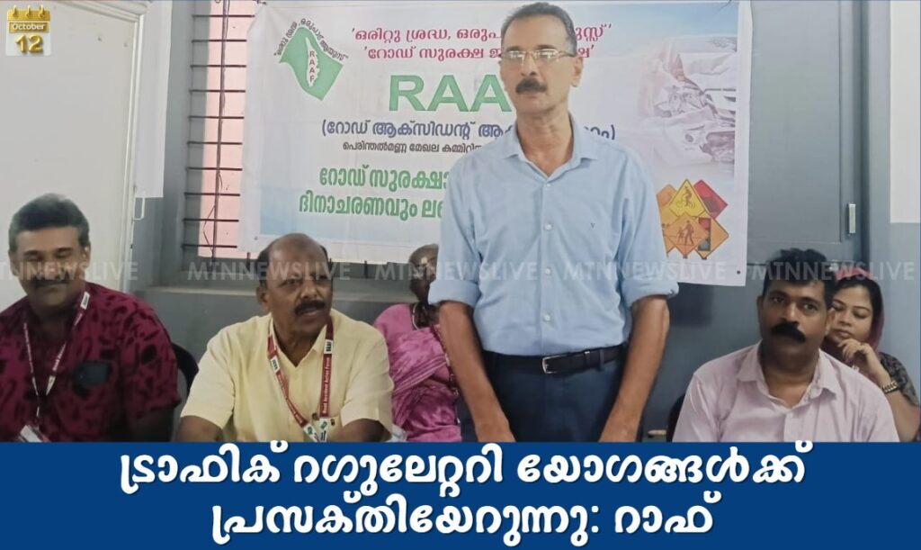 പെരിന്തൽമണ്ണ: തദ്ദേശ സ്വയം ഭരണ സ്ഥാപനങ്ങളിലെ ട്രാഫിക് റഗുലേറ്ററി കമ്മിറ്റികൾ സമയ ബന്ധിതമായി വിളിച്ചു ചേർക്കണമെന്ന് റോഡ് ആക്സിഡന്റ് ആക് ഷൻ ഫോറം മേഖല കൺവൻഷൻ ബന്ധപ്പെട്ടവരോടാവശ്യപ്പെട്ടു. റോഡുകളിലെ അറ്റകുറ്റപ്പണികൾ, റോഡു കൈയ്യേറ്റം, അമിത വേഗത എന്നിവകൾക്ക് കൗൺസിൽ യോഗങ്ങൾ ഉപകരിക്കും. ഡോക്ടർ ബക്കേഴ്സ് ഹാളിൽ സംഘടിപ്പിച്ച റോഡു സുരക്ഷ സമ്മേളനം റാഫ് സംസ്ഥാന പ്രസിഡണ്ട് ഡോ. കെ എം അബ്ദു ഉദ്ഘാടനം ചെയ്തു. ജില്ല ജനറൽ സെക്രട്ടറി ഏകെ ജയൻ അധ്യക്ഷനായിരുന്നു. മുൻ ജില്ല പോലീസ് മേധാവി യു. അബ്ദുൽ കരീം മുഖ്യപ്രഭാഷണം നടത്തി. പെരിന്തൽമണ്ണയിലെ റാഫിന്റെ പ്രവർത്തനങ്ങൾ യുവജനങ്ങളെ കൂടി ഉൾപ്പെടുത്തി കൂടുതൽ വിപുലപ്പെടുത്തണമെന്നദ്ദേഹം പറഞ്ഞു. ഏപി മെക്ക്സൺ, സിപി രാമദാസ്, എംകെ മൈമൂന, കെ മുഹമ്മദാലിഹാജി, കെ മോഹൻദാസ്,ഇ സൈനുദ്ദീൻ, എം കെ. ഫൈസൽ,സിപി മുഹമ്മദലി, ടി. അബ്ദുൽ അസീസ് എന്നിവർ സംസാരിച്ചു.സബ്ന തുളുവത്ത് സ്വാഗതവും സാവിത്രി ടീച്ചർ നന്ദിയും പറഞ്ഞു.