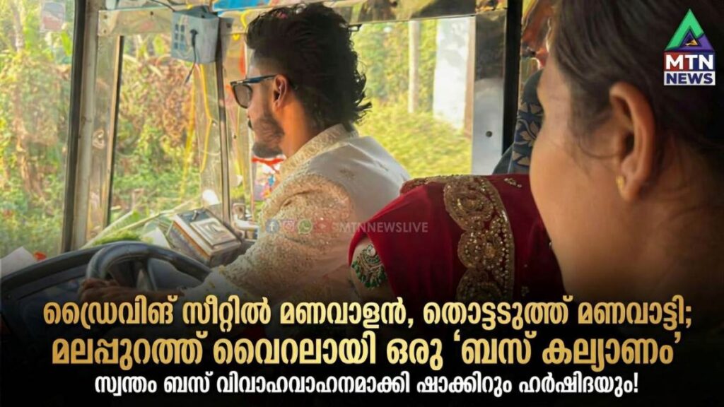 മലപ്പുറം: കല്യാണങ്ങള് പല തരത്തില് നടക്കാറുണ്ടെങ്കിലും ഷാക്കിറിന്റെയും ഹര്ഷിദയുടേയും വിവാഹയാത്ര മലപ്പുറത്ത് നവ്യാനുഭവമായി. വര്ണമനോഹരമായി പൂക്കള് കൊണ്ട് അലങ്കരിച്ച സ്വകാര്യ ബസിന്റെ ഡ്രൈവിങ് സീറ്റിൽ മണവാളനും തൊട്ടടുത്ത് മണവാട്ടിയും ഇരുന്നായിരുന്നു വിവാഹയാത്ര. ക്രിസ്തുമസ് ദിനത്തിലാണ് ഈ വേറിട്ട വിവാഹം നടന്നത്. കോട്ടക്കല് മരവട്ടം വഴി കാടാമ്പുഴ സര്വ്വീസ് നടത്തുന്ന ഫന്റാസ്റ്റിക് ബസിലെ കണ്ടക്ടര് കം ഡ്രൈവറാണ് പത്തായക്കല്ല് സ്വദേശിയായ ഷാക്കിര്. മലപ്പുറം ഗവ. കോളജിലെ ഡിഗ്രി വിദ്യാര്ഥിനിയും കോട്ടപ്പുറം ചേങ്ങോട്ടൂര് സ്വദേശിനിയുമാണ് വധു ഫര്ഷിദ. ബസ് ജീവനക്കാരനായതിനാല് ബസ് തന്നെ വിവാഹ വാഹനമാക്കണമെന്ന ഷാക്കിറിന്റെ ആഗ്രഹത്തിന് ഹര്ഷിദയും പിന്തുണ നൽകി. ബസ് ഉടമ ഏറിയസ്സന് അബ്ബാസ്, മാനേജര് ടി.ടി മൊയ്തീന് കുട്ടി എന്നിവരുടെ സമ്മതവും പിന്നാലെ മോട്ടോര് വാഹന വകുപ്പിന്റെ അനുമതിയും ലഭിച്ചതോടെയാണ് ബസ് കല്ല്യാണത്തിനായി ഒരുങ്ങിയത്. പത്തായക്കല്ലില് നിന്നും ചേങ്ങോട്ടൂരിലേക്ക് ബന്ധുക്കളുമായിട്ടായിരുന്നു യാത്ര. തിരിച്ചുള്ള യാത്രയില് സഖിയായ ഹര്ഷിദയുമുണ്ടായിരുന്നു. പത്തായക്കല്ല് പുത്തന്പീടിയന് അഹമ്മദിന്റെയും നഫീസയുടേയും മകനാണ് ഷാക്കിര്. ചേങ്ങോട്ടൂരിലെ കുന്നത്ത് ഹമീദിന്റെയും റഷീദയുടേയും മകളാണ് ഹര്ഷിദ. വഴിയരികിൽ കണ്ട യാത്രക്കാർക്കും നാട്ടുകാർക്കും അത്ഭുതവും കൗതുകവും സമ്മാനിച്ച ഈ വിവാഹയാത്രയ്ക്ക് ഇപ്പോൾ ആശംസകളുടെ പ്രവാഹമാണ്.