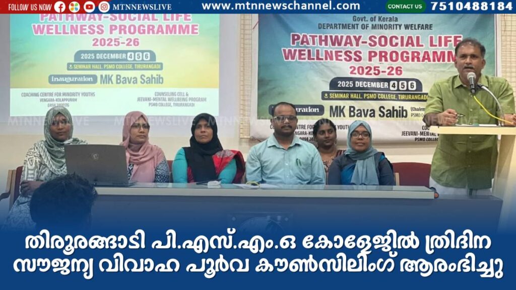തിരൂരങ്ങാടി: സംസ്ഥാന ന്യൂനപക്ഷ ക്ഷേമ വകുപ്പിന് കീഴിൽ വേങ്ങര- കൊളപ്പുറം കേന്ദ്രമായി പ്രവർത്തിക്കുന്ന കോച്ചിംഗ് സെന്റർ ഫോർ മൈനോരിറ്റി യൂത്തിന്റെയും, തിരുരങ്ങാടി പി.എസ്.എം.ഒ കോളേജ് കൗൺസലിംഗ് സെല്ലിന്റെയും, ജീവനി മെന്റൽ വെൽബീയിംഗ് പ്രോഗ്രാമിന്റെയും സംയുക്താഭിമുഖ്യത്തിൽ സംഘടിപ്പിക്കുന്ന മൂന്ന് ദിവസത്തെ സൗജന്യ വിവാഹ പൂർവ കൗൺസിലിംഗ് ട്രെയിനിംഗ് പ്രോഗ്രാം ആരംഭിച്ചു. കോളേജ് മാനേജ്മെന്റ് കമ്മിറ്റി ചെയർമാൻ എം.കെ ബാവ സാഹിബ് ഉദ്ഘാടനം നിർവഹിച്ചു. കോളേജ് പ്രിൻസിപ്പാൾ ഡോ. കെ. നിസ്സാമുദ്ദീൻ അധ്യക്ഷത വഹിച്ചു. വിവാഹ ജീവിതത്തിന്റെ സാമൂഹിക പ്രാധാന്യം വിദ്യാർഥികളിൽ എത്തിക്കുകയും അതുവഴി കൃത്യമായ അവബോധം സൃഷ്ടിക്കുകയുമാണ് പ്രീമാരിറ്റൽ കൗൺസിലിംഗിന്റെ ലക്ഷ്യം. മൂന്ന് ദിവസങ്ങളിലായി ആറു സെഷനുകളായാണ് ട്രെയിനിംഗ് പ്രോഗ്രാം ക്രമീകരിച്ചിരിക്കുന്നത്. ദാമ്പത്യ ജീവിതത്തിന്റെ മുന്നൊരുക്കങ്ങൾ, സന്തുഷ്ട കുടുംബജീവിതം, വിവാഹത്തിലെ നിയമ-സദാചാര വശങ്ങൾ, കോൺഫ്ലിക്ട് മാനേജ്മെന്റ്, ബഡ്ജറ്റിങ്, പാരന്റിങ്, ലൈംഗികാരോഗ്യം എന്നീ വിഷയങ്ങളെ ആസ്പദമാക്കിയാണ് ക്ലാസുകൾ നടക്കുന്നത്. വൈവാഹിക കുടുംബ ജീവിതത്തെക്കുറിച്ച് വ്യക്തമായ കാഴ്ചപ്പാട് രൂപപ്പെടുത്താൻ ഈ പരിശീലനത്തിലൂടെ വിദ്യാർഥികൾക്ക് സാധിക്കും. ചടങ്ങിൽ സി.സി.എം.വൈ (CCMY) വേങ്ങര പ്രിൻസിപ്പാൾ മുനീറ, കോളേജ് കൗൺസിലിങ് സെൽ കോർഡിനേറ്റർ എം. സലീന എന്നിവർ ആശംസകൾ അർപ്പിച്ചു. കോളേജ് ജീവനി മെന്റൽ വെൽബീയിംഗ് സെൽ കോർഡിനേറ്റർ ഡോ. കെ. റംല സ്വാഗതവും ജീവനി കൗൺസിലർ പി. ശ്രുതി നന്ദിയും പറഞ്ഞു.
