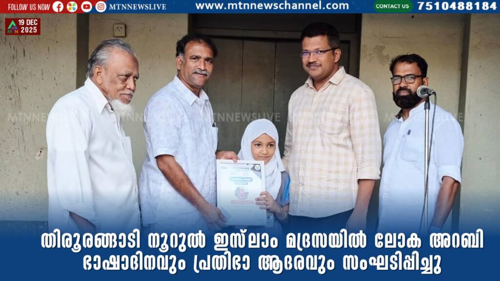 തിരൂരങ്ങാടി: നൂറുൽ ഇസ്ലാം മദ്രസയിൽ ലോക അറബി ഭാഷാദിനം വിവിധ പരിപാടികളോടെ സമുചിതമായി ആഘോഷിച്ചു. ഇതോടനുബന്ധിച്ച് സംസ്ഥാന സർഗമേളയിലേക്ക് യോഗ്യത നേടിയ വിദ്യാർത്ഥികളെയും പരീക്ഷയിൽ ഉയർന്ന മാർക്ക് നേടിയ കുട്ടികളെയും ആദരിക്കുന്ന പ്രത്യേക ചടങ്ങും നടന്നു. തിരൂരങ്ങാടി മുസ്ലിം ഓർഫനേജ് കമ്മിറ്റി ജനറൽ സെക്രട്ടറി എം.കെ. ബാവ സാഹിബ് ആഘോഷപരിപാടികളുടെ ഉദ്ഘാടനവും പ്രതിഭകൾക്കുള്ള സമ്മാനദാനവും നിർവ്വഹിച്ചു. അറബി ഭാഷയുടെ ആത്മീയ-സാംസ്കാരിക മൂല്യങ്ങളെക്കുറിച്ച് അദ്ദേഹം സംസാരിച്ചു. സദർ മുദരിസ് എൻ.പി. അബു മാസ്റ്റർ അധ്യക്ഷത വഹിച്ച ചടങ്ങിൽ സി.എൻ. അബ്ദുൽ നാസർ മാസ്റ്റർ അറബി ഭാഷാദിന സന്ദേശം നൽകി. ഭാഷയുടെ ചരിത്രപ്രാധാന്യവും വർത്തമാനകാല പ്രസക്തിയും അദ്ദേഹം കുട്ടികൾക്ക് വിശദീകരിച്ചു നൽകി. സ്റ്റാഫ് സെക്രട്ടറി മുനീർ താനാളൂർ സ്വാഗതം ആശംസിച്ച യോഗത്തിൽ ഒ.പി. അനീസ് ജാബിർ മാസ്റ്റർ നന്ദി രേഖപ്പെടുത്തി. വി. അലി മാസ്റ്റർ, കെ. ജംഷീന ടീച്ചർ, കെ. സൈനബ ടീച്ചർ, കെ. ഖദീജ ടീച്ചർ, അനീസ് മാസ്റ്റർ, ഒ.പി. മുംതാസ് ടീച്ചർ, ഫൗസീല ടീച്ചർ, പി. ഫഹദ് മാസ്റ്റർ തുടങ്ങിയവർ ആശംസകളർപ്പിച്ച് സംസാരിച്ചു. രക്ഷിതാക്കളുടെയും കുട്ടികളുടെയും നിറഞ്ഞ പങ്കാളിത്തം പരിപാടിക്ക് മിഴിവേകി.