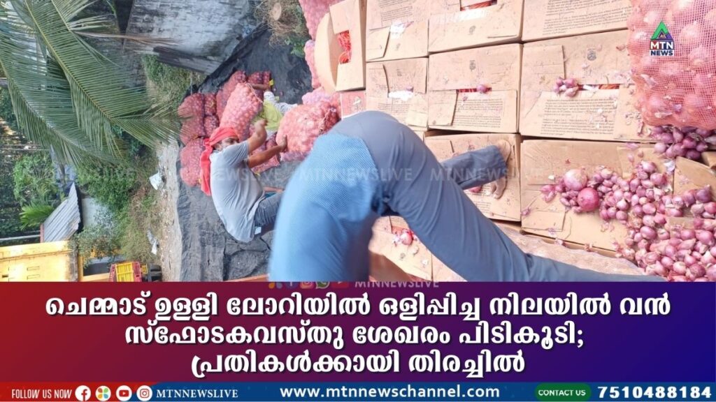 ചെമ്മാട് ഉള്ളി ലോറിയിൽ ഒളിപ്പിച്ചു കടത്തുകയായിരുന്ന വൻ സ്ഫോടകവസ്തു ശേഖരം പോലീസ് പിടികൂടി. ജലാറ്റിൻ സ്റ്റിക്കുകൾ, ഡിറ്റനേറ്റർ വയറുകൾ എന്നിവയാണ് കണ്ടെടുത്തത്. ചെമ്മാടുള്ള ഒരു ഹോളോ ബ്രിക്സ് കടയ്ക്കുള്ളിൽ നിർത്തിയിട്ടിരുന്ന ലോറിയിൽ നിന്നാണ് ഇവ കണ്ടെത്തിയത്. ഉള്ളി ലോഡുമായി എത്തിയ ലോറിയിൽ ബോക്സുകളിലാക്കിയാണ് സ്ഫോടകവസ്തുക്കൾ ഒളിപ്പിച്ചിരുന്നത്. ഇന്നലെ രാത്രി ലോറിയിൽ നിന്ന് ഉള്ളി മാറ്റാനായി മറ്റൊരു ചെറിയ ലോറിയും കാറിലും ആളുകളെത്തിയിരുന്നു. ഈ സമയത്ത് രഹസ്യ വിവരത്തിന്റെ അടിസ്ഥാനത്തിൽ പോലീസ് സ്ഥലത്തെത്തി. പോലീസിനെ കണ്ടതോടെ ലോറി ഡ്രൈവറും കൂടെയുണ്ടായിരുന്നവരും ഓടി രക്ഷപ്പെട്ടു.