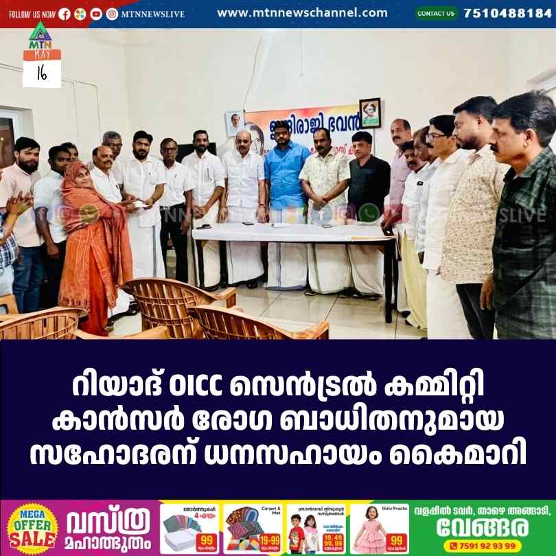 വേങ്ങര: റിയാദ് OICC സെൻട്രൽ കമ്മിറ്റിയുടെ കുടുംബ സുരക്ഷാ പദ്ധതിയിൽ അംഗമായ വേങ്ങര വലിയോറ 14 ആം വാർഡ് സ്വദേശിയും കാൻസർ രോഗ ബാധിതനുമായ സഹോദരന് റിയാദ് OICC മലപ്പുറം ജില്ലാ കമ്മിറ്റി നൽകുന്ന 50000 രൂപയുടെ ധനസഹായം റിയാദ് ഒ ഐ സി സി മലപ്പുറം ജില്ലാ ട്രഷറർ സാദിക്ക് വടപ്പുറം വേങ്ങര മണ്ഡലം കോൺഗ്രസ് പ്രസിഡണ്ട് രാധാകൃഷ്ണൻ മാസ്റ്റർ വാർഡ് മെമ്പർ ആസിയ മുഹമ്മദ് എന്നിവർക്ക് കൈമാറി. വേങ്ങര ഇന്ദിരാഭവനിൽ വെച്ചു നടന്ന പരിപാടിയിൽ മണ്ഡലം കോണ്ഗ്രസ് പ്രസിഡന്റ് രാധാകൃഷ്ണൻ മാസ്റ്റർ അധ്യക്ഷത വഹിച്ചു, ജില്ലാ കോൺഗ്രസ്കമ്മിറ്റി വൈസ് പ്രസിഡന്റ് ഷാജി പച്ചിരി, ജനറൽ സെക്രട്ടറി ഹാരിസ് ബാബു ചാലിയാർ. ഒ. ഐ. സി. സി. സെൻട്രൽ കമ്മിറ്റി ജനറൽ സെക്രട്ടറി സക്കീർ ദാനത്ത്, ഒ. ഐ. സി. സി. മലപ്പുറം ജില്ലാ ട്രഷറർ സാദിക്ക് വടപ്പുറം, ഒ ഐ സി സി ജില്ലാ സെക്രട്ടറി ബഷീർ വണ്ടൂർ, ഡിസിസി മെമ്പർ എ. കെ. എ.നസീർ, മൈനോറിറ്റി കോൺഗ്രസ് ജില്ലാ വൈസ് ചെയർമാൻ ശക്കിർ അലി കണ്ണെത്ത്, ഒ ഐ സി സി നാഷണൽ കമ്മിറ്റി മെമ്പർ വി. കെ.ചന്ദ്രമോഹൻ, മുഹമ്മദ് മണ്ടോടൻ, വേങ്ങര മണ്ഡലം കോൺഗ്രസ് കമ്മിറ്റി വൈസ് പ്രസിഡണ്ടുമാരായ.പി. കെ.കുഞ്ഞിൻ ഹാജി, സി. എച്ച് സലാം, യൂത്ത് കോൺഗ്രസ് നിയോജക മണ്ഡലം സെക്രട്ടറി ശാക്കിർ കാലടിക്കൽ, മണ്ഡലം കോൺഗ്രസ് കമ്മിറ്റി ജനറൽ സെക്രട്ടറി വി. ടി. മൊയ്ദീൻ, പാണ്ടികശാല യൂണിറ്റ് ഭാരവാഹികളായ ബാബു പാണ്ടികശാല, സുധിഷ് പാണ്ടികശാല, ബാലൻ പാണ്ടികശാല, പതിനാലാം വാർഡ് കോൺഗ്രസ് പ്രസിഡണ്ട് അസിസ് കൈപ്പറൻ തുടങ്ങിയ നേതാക്കൾ പങ്കെടുത്തു,