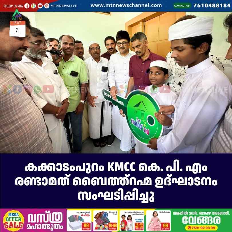 കക്കാടംപുറം KMCC കെ. പി. എം രണ്ടാമത് ബൈത്ത്റഹ്മ പാണക്കാട് സയ്യിദ് സാദിഖ് അലി ശിഹാബ് തങ്ങൾ ഉദ്ഘാടനം ചെയ്തു, കെ. പി സുബൈർ അദ്ധ്യക്ഷത വഹിച്ചു, പഞ്ചായത്ത് മുസ് ലിം ലീഗ് ഭാരവാഹികളായ എ.പി ഹംസ, ഇസ്മായിൽ പുങ്ങാടൻ, സി.കെ മുഹമ്മദ് ഹാജി, റസാഖ് അരിക്കൻ, ഗ്രാമ പഞ്ചായത്ത് പ്രസിഡണ്ട് റഷിദ് കൊണ്ടണത്ത്, വാർഡ് മെമ്പർ കെ.സി അച്ചുമ്മ കുട്ടി,എസ്.ടി.യു മണ്ഡലം ട്രഷറർ സി.പി മരക്കാർ ഹാജി, പഞ്ചായത്ത് മുസ് ലിം യൂത്ത് ലീഗ് ഭാരവാഹികളായ കെ.ടി ഷംസുദ്ധീൻ,മുനീർ വിലാശേരി, കെ.കെ സകരിയ , വാർഡ് ലീഗ് ഭാരവാഹികളായ അരീക്കൻ കുഞ്ഞിമുഹമ്മദ്, മെയ്തീൻകുട്ടി കേതോരി, കെ.സി ഹംസ, പി.കെ ആലസൻ കുട്ടി,അഷറഫ് പാവിൽ, കെ.സി സലിം , കെ. എം റിയാസ്, കെ.കെ മെയ്തീൻ കുട്ടി,പി.കെ ഉസ്മാൻ, പി.വി മുനീർ കോയ കള്ളിയത്ത്, സത്താർ കുറ്റൂർ, യുസുഫ് പാലത്തിങ്ങൽ, ഷംസു പാലത്തിങ്ങൽ, കെ.എം റഹിം,കെ.എം.സി. സി ഭാരവാഹികളായ ഹസൈൻ പാലത്തിങ്ങൽ, കെ.കെ സീദ്ധീഖ്, അരീക്കൻ അബ്ദു , പി.ടി ഹനിഫ, അരീക്കൻ മുസ, പി.കെ മുഹമ്മദ് കുട്ടി, കെ.കെ ഇല്യാസ് സി.വി മുഹമ്മദലി, കെ. പി നാസർ, കെ.കെ റഷിദ്, കെ.എം നൗഫൽ, കള്ളിയത്ത് റഷിദ്, മഹല്ല് ഭാരവാഹികളും, പൗരപ്രമുഖരും എന്നിവർ സംബധിച്ചു.