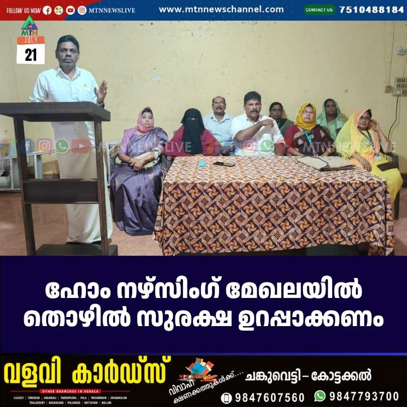 വേങ്ങര: ഹോം നഴ്സിംഗ് മേഖലയില് തൊഴില് ചെയ്യുന്ന തൊഴിലാളികള്ക്ക് തൊഴില് സുരക്ഷയും പ്രത്യേക ക്ഷേമനിധിയും ആഘോഷവേളകളില് ബോണസും അനുവദിക്കണമെന്ന് ഹോം നഴ്സിംഗ് സര്വീസ് മലപ്പുറം ജില്ലാ കമ്മിറ്റി ആവശ്യപ്പെട്ടു. ജില്ലാ പ്രസിഡണ്ട് റൈഹാനത്ത് ബീവി അധ്യക്ഷത വഹിച്ചു. വാത്സല്യം ചാരിറ്റബിള് സൊസൈറ്റി സംസ്ഥാന പ്രസിഡണ്ട് അഷ്റഫ് മനരിക്കല് ഉദ്ഘാടനം ചെയ്തു. അസൈനാര് ഊരകം, ബേബി എസ് പ്രസാദ്, റാഹില എസ്, ഷാഹിദാ ബീവി , നൗഷാദ് വി കെ , അസൂറ ബീവി, ഹസീന എ കെ, ആമിന പി കെ. തുടങ്ങിയവര് സംസാരിച്ചു.