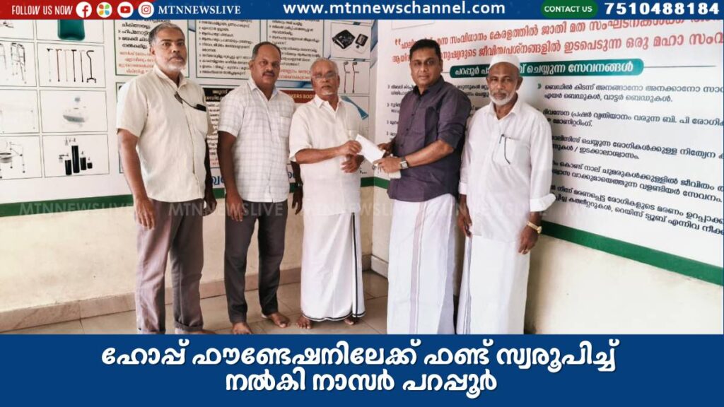 ഇരിങ്ങല്ലൂർ പെട്രോൾ പമ്പിന് എതിർവശത്തായി നാല് നിലയിൽ 40 ബെഡ് സൗകര്യത്തോടെ ആരംഭിക്കുന്ന ഹോപ്പ് ഫൗണ്ടേഷൻ ഡയാലിസിസ് സെൻ്ററിൻ്റെ കെട്ടിട നിർമാണത്തിലേക്ക് അമ്പതിനായിരം രൂപ സ്വരൂപിച്ച് നൽകി. വേങ്ങര ബ്ളോക്ക് ഡിവിഷൻ മെമ്പറും ബ്ളോക്ക് കോൺഗ്രസ് പ്രസിഡൻ്റുമായ നാസർ പറപ്പൂർ. പലിയേറ്റീവിൽ വെച്ച് നടന്ന ചടങ്ങിൽ ഹോപ്പ് ഫൗണ്ടേഷൻ കെട്ടിട നിർമാണ കമ്മറ്റി ചെയർമാൻ നല്ലൂർ മജീദ് മാസ്റ്റർക്ക് ഫണ്ട് കൈമാറി. ഹോപ്പ് ഫൗണ്ടേഷൻ ഭാരവാഹികളായ എ.പി മൊയ്തുട്ടി ഹാജി, എം.കെ. ഷാഹുൽ ഹമീദ്, ഓഫീസ് അസിസ്റ്റൻ്റ് ഹനീഫ എന്നിവരും പങ്കെടുത്തു.