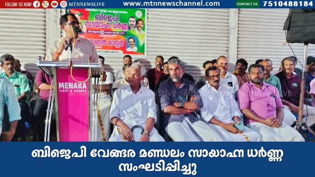 വേങ്ങര : ഭക്തർ നൽകിയ വഴിപാടുകൾ കൊള്ളയടിച്ച ശബരിമലയിലെ സ്വർണ്ണ കൊള്ള നടത്തിയവർക്കെതിരെ സി ബി ഐ അന്വേഷണം ആവശ്യപ്പെട്ടു കൊണ്ടും ദേവസ്വം മന്ത്രി വാസവൻ രാജിവെയ്ക്കണം എന്നാവശ്യപ്പെട്ട് കൊണ്ടും ബിജെപി സംസ്ഥാനമൊട്ടുക്കും നടത്തി വരുന്ന പ്രതിഷേധ പരിപാടികളുടെ ഭാഗമായി ബിജെപി വേങ്ങര മണ്ഡലം കമ്മിറ്റിയുടെ നേതൃത്വത്തിലുള്ള സായാഹ്ന ധർണ്ണ എ ആർ നഗർ കൊടുവായൂരിൽ വെച്ച് നടന്നു. ബിജെപി പാലക്കാട് മേഖല പ്രസിഡണ്ട് കെ നാരായണൻ മാസ്റ്റർ ഉദ്ഘാടനം ചെയ്തു. ബിജെപി വേങ്ങര മണ്ഡലം പ്രസിഡണ്ട് വി എൻ ജയകൃഷ്ണൻ അദ്യക്ഷനായ ധർണ്ണയിൽ ബിജെപി മലപ്പുറം സെൻട്രൽ ജില്ല പ്രസിഡണ്ട് പി സുബ്രഹ്മണ്യൻ, ജില്ല ട്രഷറും വേങ്ങര മണ്ഡലം പ്രഭാരിയുമായ സി എം സുകുമാരൻ, മണ്ഡലം ജനറൽ സെക്രട്ടറമാരായ ടി ജനാർദ്ദനൻ, എൻ കെ ശ്രീധർ തുടങ്ങിയവർ സംസാരിച്ചു. മണ്ഡലം ഭാരവാഹികളായ സി പി അജികുമാർ, ടി പി സുരേഷ്ബാബു, കെ പി സജീഷ്, പി സിന്ധു, പി സുനിൽകുമാർ, സി വിനോദ്കുമാർ, കെ കമലം, ടി പി രാധാകൃഷ്ണൻ, ന്യൂനപക്ഷമോർച്ച സെൻട്രൽ ജില്ല പ്രസിഡണ്ട് ഒ സി അദ്നാൻ, ജില്ല സോഷ്യൽ മീഡിയ കൺവീനർ പി ബൈജു, വേങ്ങര മണ്ഡലം വിവിധ മോർച്ച പ്രസിഡണ്ടുമാരായ കെ എം സുധീഷ്, വി പി രവി, ബിജെപി പഞ്ചായത്ത് പ്രസിഡണ്ടുമാരായ കെ ടി നാരായണൻ,വി എൻ വാസുദേവൻ, എൻ കെ ദീപേഷ്, ജില്ല കമ്മിറ്റി അംഗങ്ങളായ കെ പി വിബീഷ്, പി പരമേശ്വരൻ,സി കുട്ടൻ, പഴയകാല കാര്യകർത്താക്കളായിരുന്ന സി പി ഭാസ്കരൻ, സി പി കണ്ടർ തുടങ്ങിയവർ സംബന്ധിച്ചു.