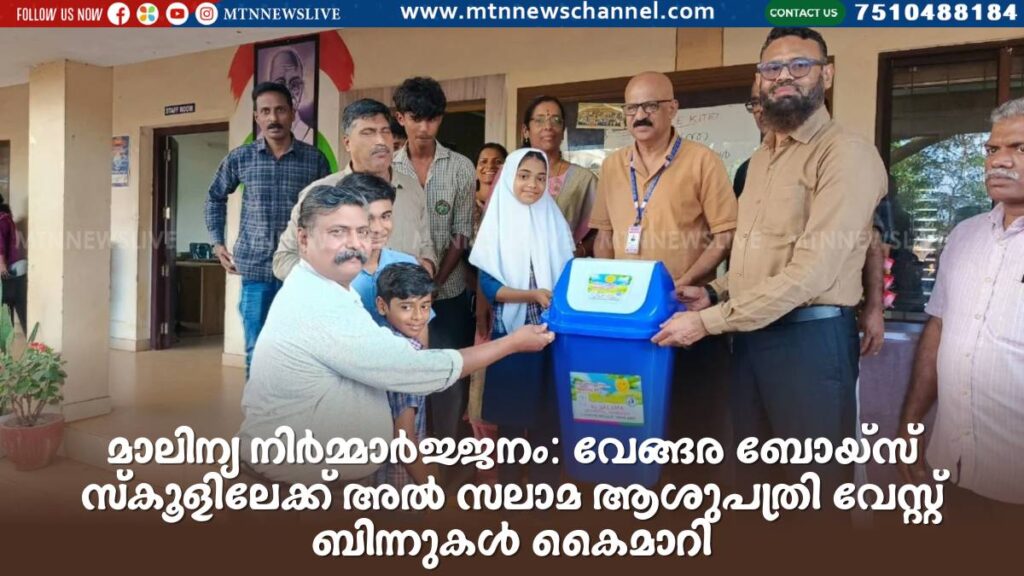 വേങ്ങര: മാലിന്യ നിർമ്മാർജ്ജന പദ്ധതിയുടെ ഭാഗമായി ജി.വി.എച്ച്.എസ്.എസ് വേങ്ങര (ബോയ്സ് ഹൈസ്ക്കൂൾ) കോമ്പൗണ്ടിൽ സ്ഥാപിക്കുന്നതിലേക്കായി വേങ്ങര അൽ സലാമ ആശുപത്രി 10 വേസ്റ്റ് ബിന്നുകൾ സ്പോൺസർ ചെയ്തു. സ്കൂളിൽ നടന്ന ചടങ്ങിൽ അൽ സലാമ ആശുപത്രി ജനറൽ മാനേജർ അബ്ദുറഹ്മാൻ കുട്ടിയിൽ നിന്നും പ്രിൻസിപ്പാൾ പ്രേം ഭാസ്, വിദ്യാർത്ഥികൾ എന്നിവർ ചേർന്ന് ബിന്നുകൾ ഏറ്റുവാങ്ങി. സ്കൂൾ പി.ടി.എ പ്രസിഡന്റും അൽ സലാമ ആശുപത്രി ഓപ്പറേഷൻ മാനേജറുമായ മീരാൻ വേങ്ങര ചടങ്ങിൽ അധ്യക്ഷത വഹിച്ചു. അബ്ദുറഹ്മാൻ കുട്ടി, പി.ടി.എ വൈസ് പ്രസിഡന്റ് മുജീബ് പറമ്പത്ത്, വി.എച്ച്.എസ്.ഇ പ്രിൻസിപ്പാൾ ജിൻസി ടീച്ചർ, സൈദ് മാഷ് എന്നിവർ ആശംസകളർപ്പിച്ച് സംസാരിച്ചു. പ്രിൻസിപ്പാൾ പ്രേം ഭാസ് സ്വാഗതവും ഹെഡ് മിസ്ട്രസ് ഷീന ടീച്ചർ നന്ദിയും രേഖപ്പെടുത്തി.